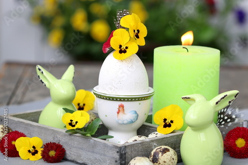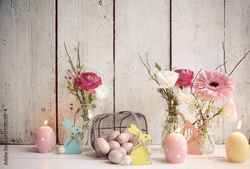 Osterdekoration Mit Blumen Im Ei Osterhasen Und Kerze Buy This Stock Photo And Explore Similar Images At Adobe Stock Adobe Stock