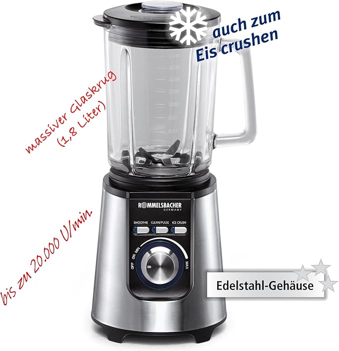 Amazon De Rommelsbacher Mx 850 Standmixer Smoothie Maker Glas 850 W 20 000 U Min 1 8 L Edelstahl Messer 4 Flugelig Ice Crush Funktion Edelstahl Gehause Edelstahl Silber