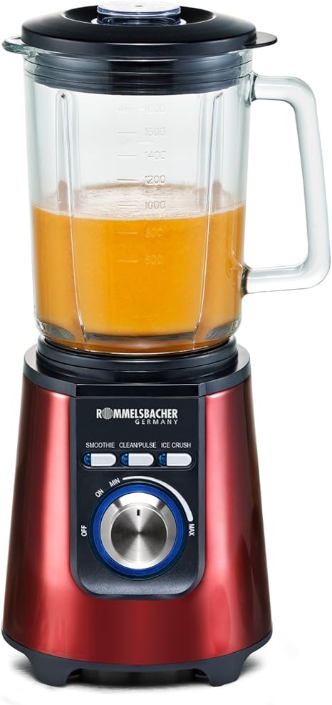 Amazon De Rommelsbacher Mx 1205 R Standmixer Smoothie Maker Glas 1200 W 20 000 U Min 1 8 L Wellenschliff Edelstahl Messer 4 Flugelig Ice Crush Funktion Edelstahl Gehause Metallic Rot